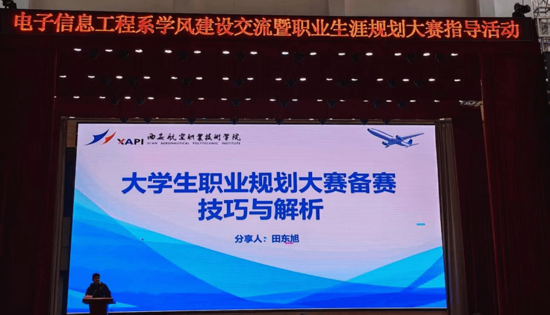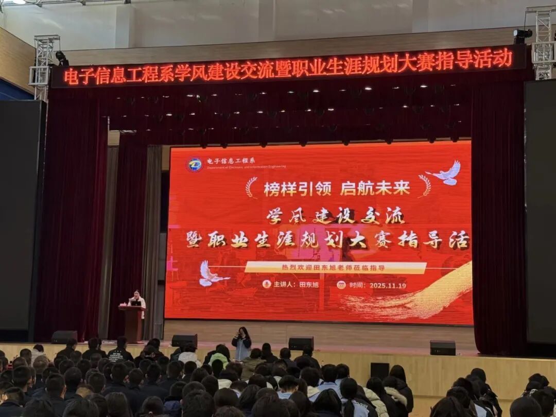 为深入推进学风建设,引导学生树立正确的职业观与成才观,11月19日下午,由电子信息工程系主办的“榜样引领,启航未来”学风建设交流暨职业规划大赛指导活动在学院大学生活动中心圆满举行。本次活动立足我系,面向全院,特邀西安航空职业技术学院田东旭老师担任主讲,不仅我系全体师生积极参与,更吸引了众多兄弟院系的师生到场观摩学习,现场座无虚席,气氛热烈。