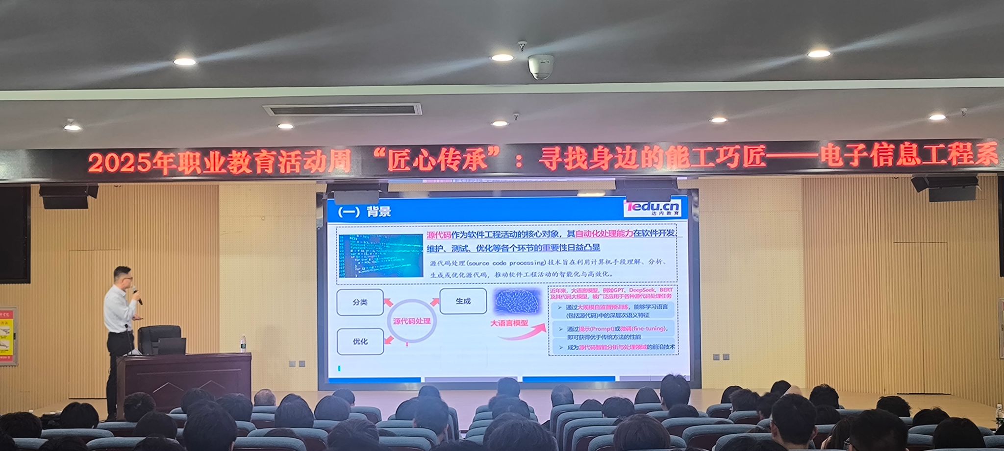 为了深入贯彻落实国家关于职业教育高质量发展的重要部署,弘扬工匠精神,深化产教融合,2025年5月14日,电子信息工程系在学院第二阶教室成功举办“匠心传承:寻找身边的能工巧匠”职业教育专题活动。