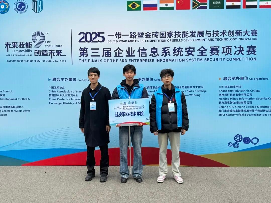 2025年11月2日,2025“一带一路”暨金砖国家技能发展与技术创新大赛之第三届企业信息系统安全赛项全国总决赛在山东理工职业学院落下帷幕。由电子信息工程系卫林龙、任浩然老师指导,王一达、于泽成同学组成的参赛团队,凭借出色发挥,荣获西部赛区选拔赛一等奖、全国总决赛三等奖的优异成绩。